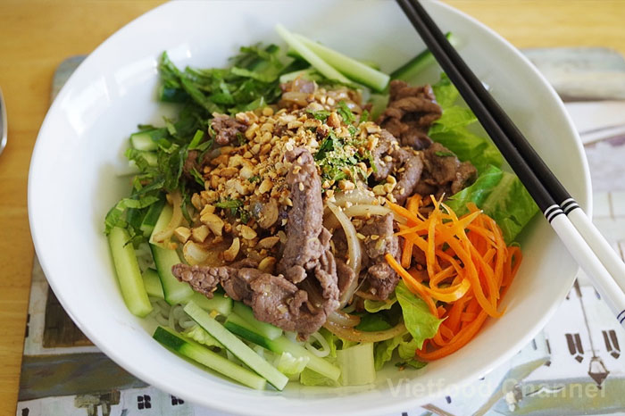 It is amazing and interesting one kind of traditional Vietnamese food made from beef and herb: a bed of rice noodles is topped by tender grilled beef, chopped cucumbers, lettuce, papaya slivers, fresh herbs, crushed peanuts and heaps of crunchy fried onions. Mix it with fish sauce–spiked nước chấm, take a bite, moan and repeat.